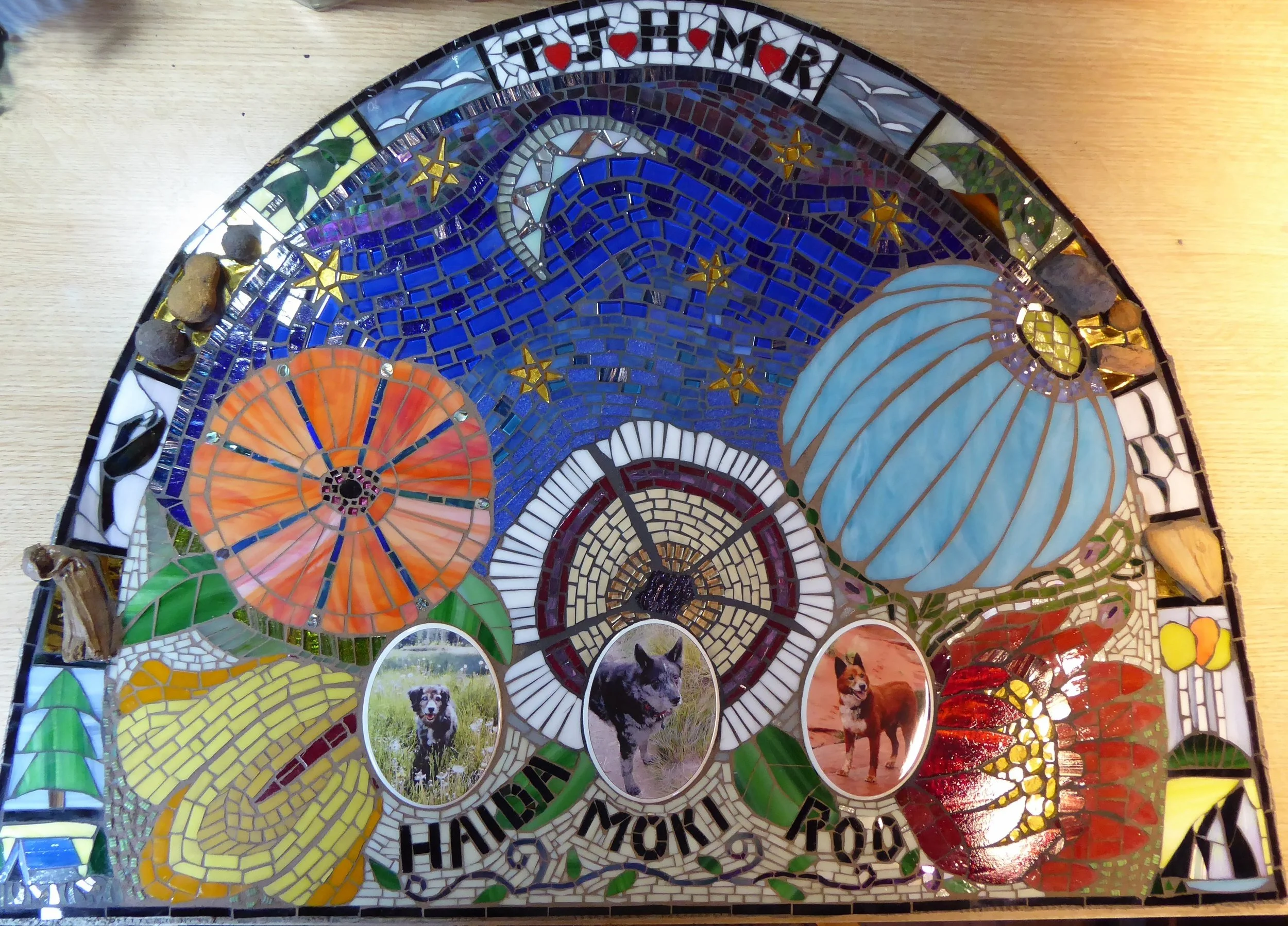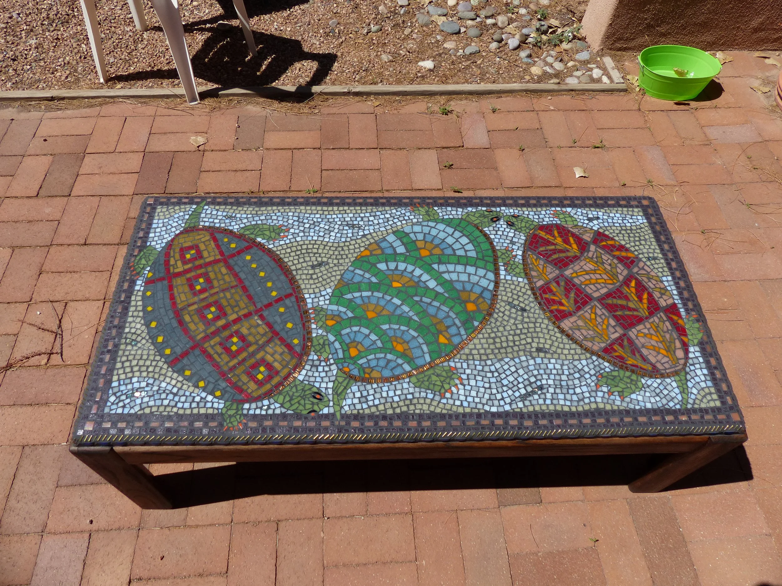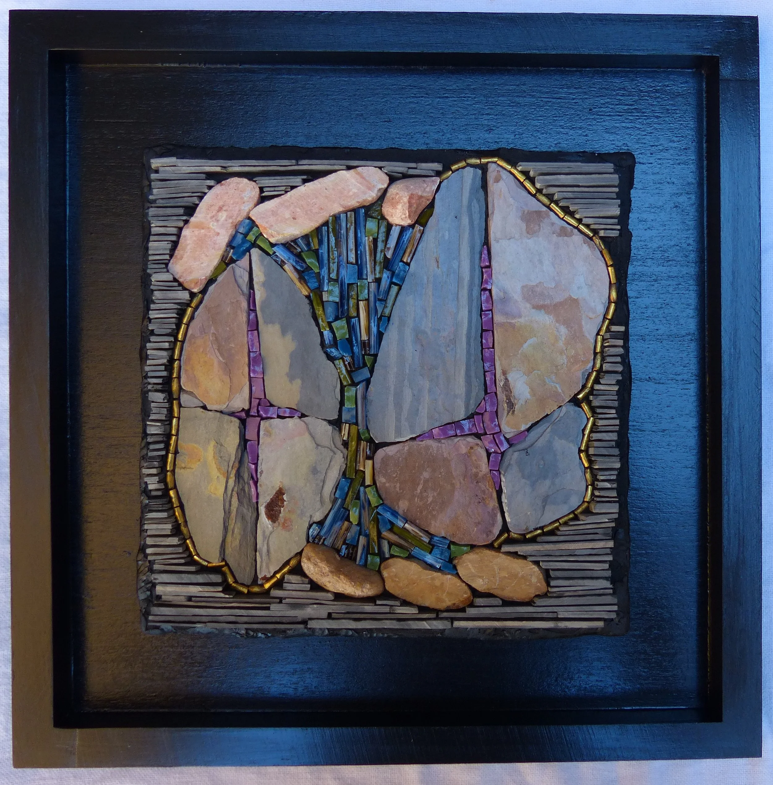 I am a self-taught mosaic artist. I have been working with glass, tiles, slate, rocks, found objects, and have been building small sculptures and composing more traditional pictures, and experimenting, for over a decade. When I give myself the time to immerse myself in the work, I love it.